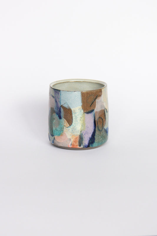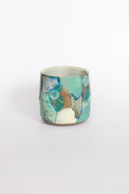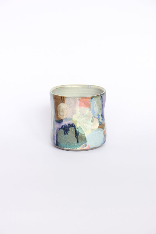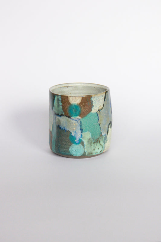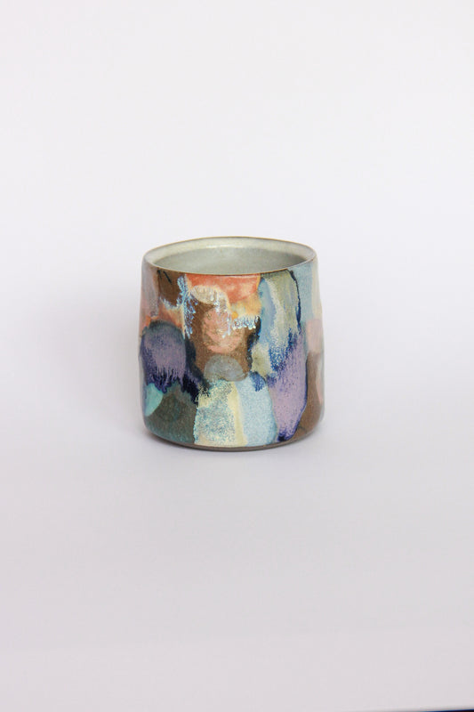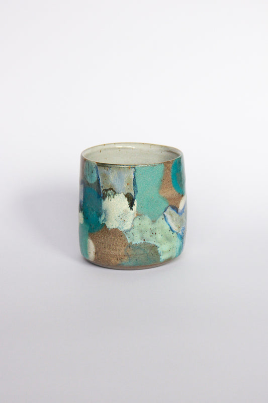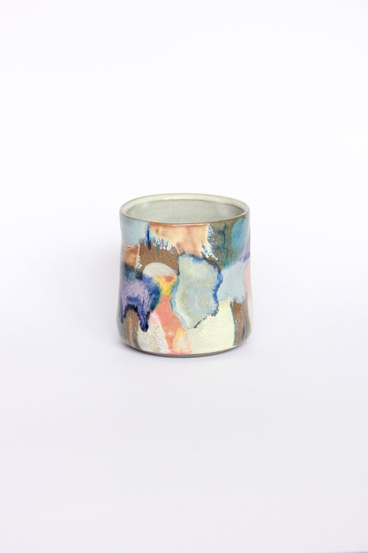 Each cup is wheel-thrown and gently altered by hand, creating subtle shifts in shape that sit comfortably in the palm. Layered glazes move across the surface, allowing colour to pool, break and settle differently on every piece.