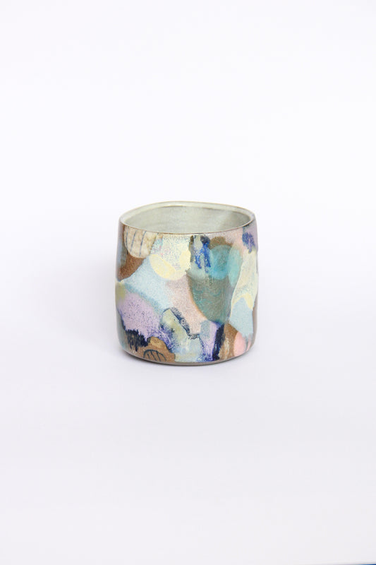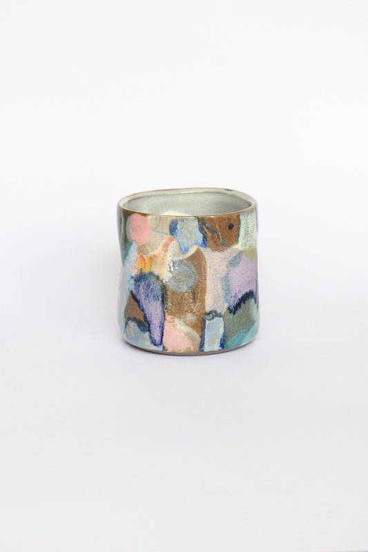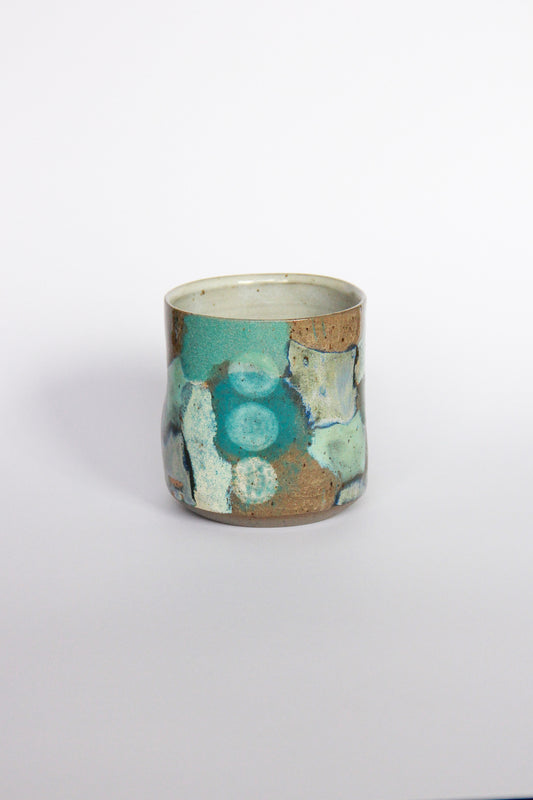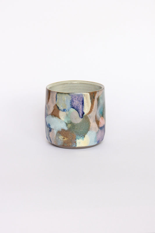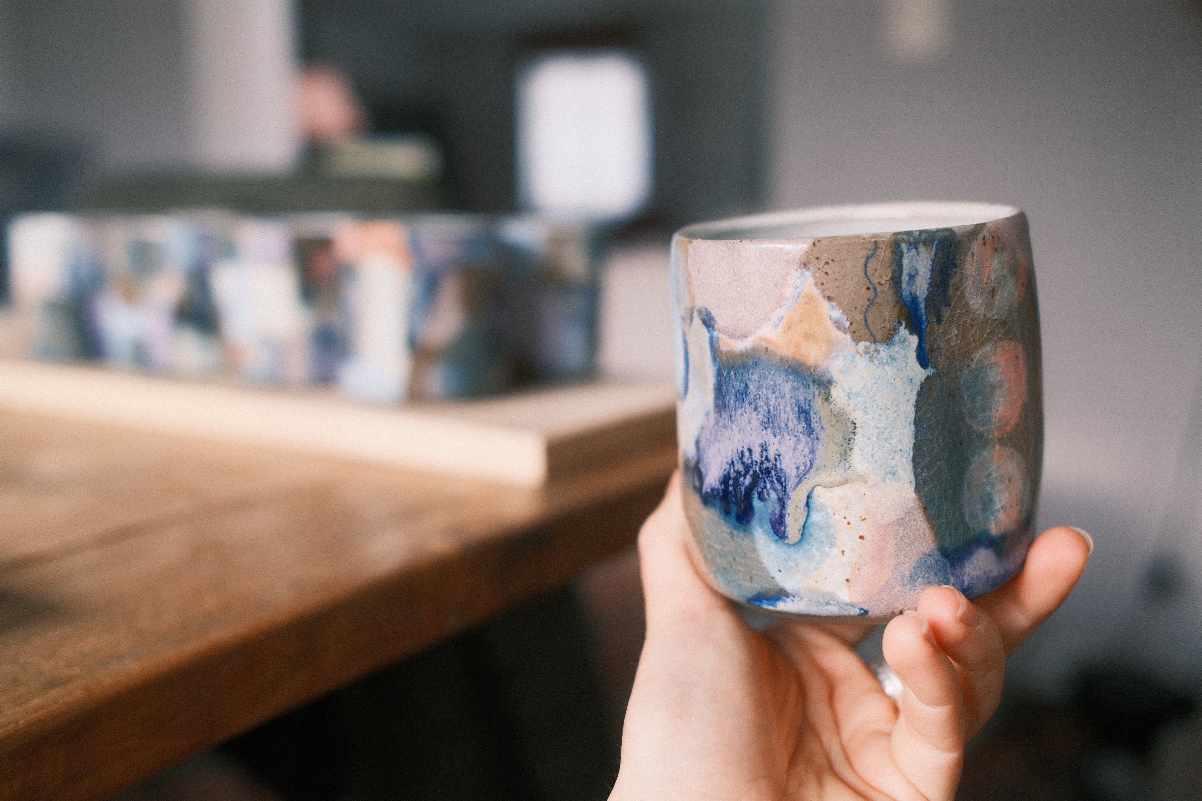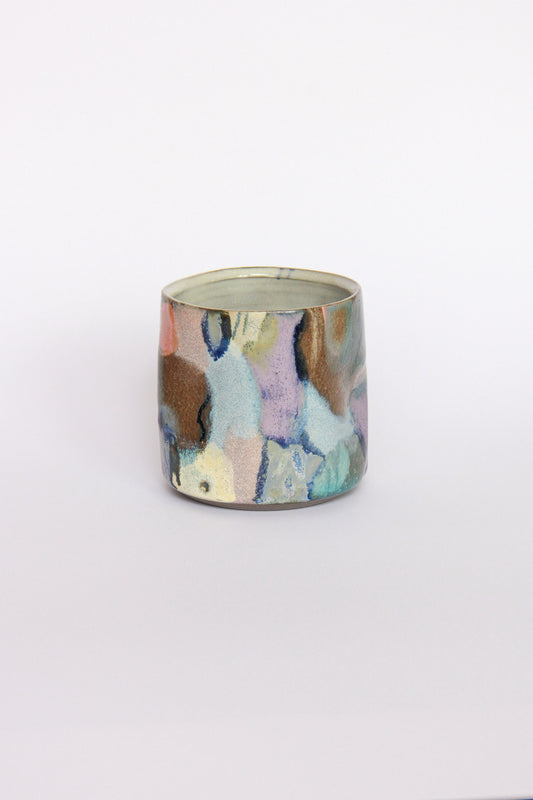 Each cup is wheel-thrown and gently altered by hand, creating subtle shifts in shape that sit comfortably in the palm. Layered glazes move across the surface, allowing colour to pool, break and settle differently on every piece.