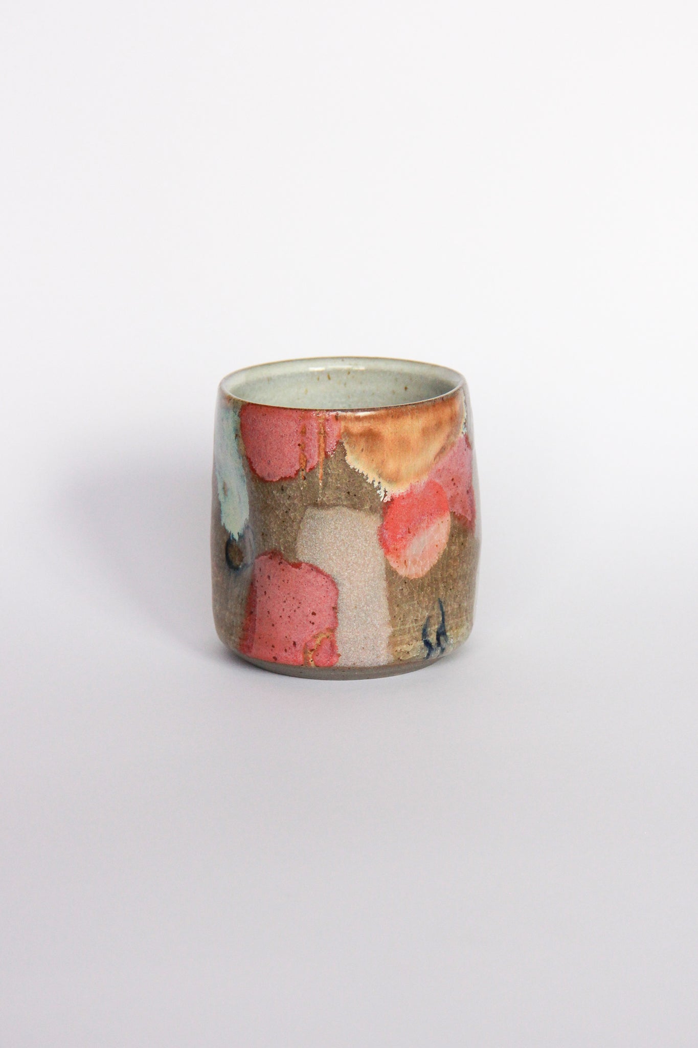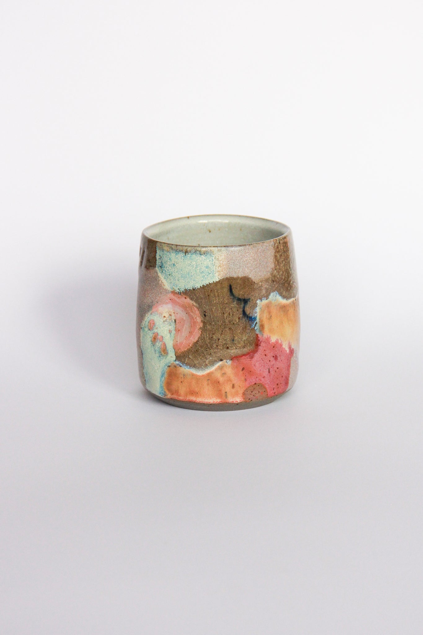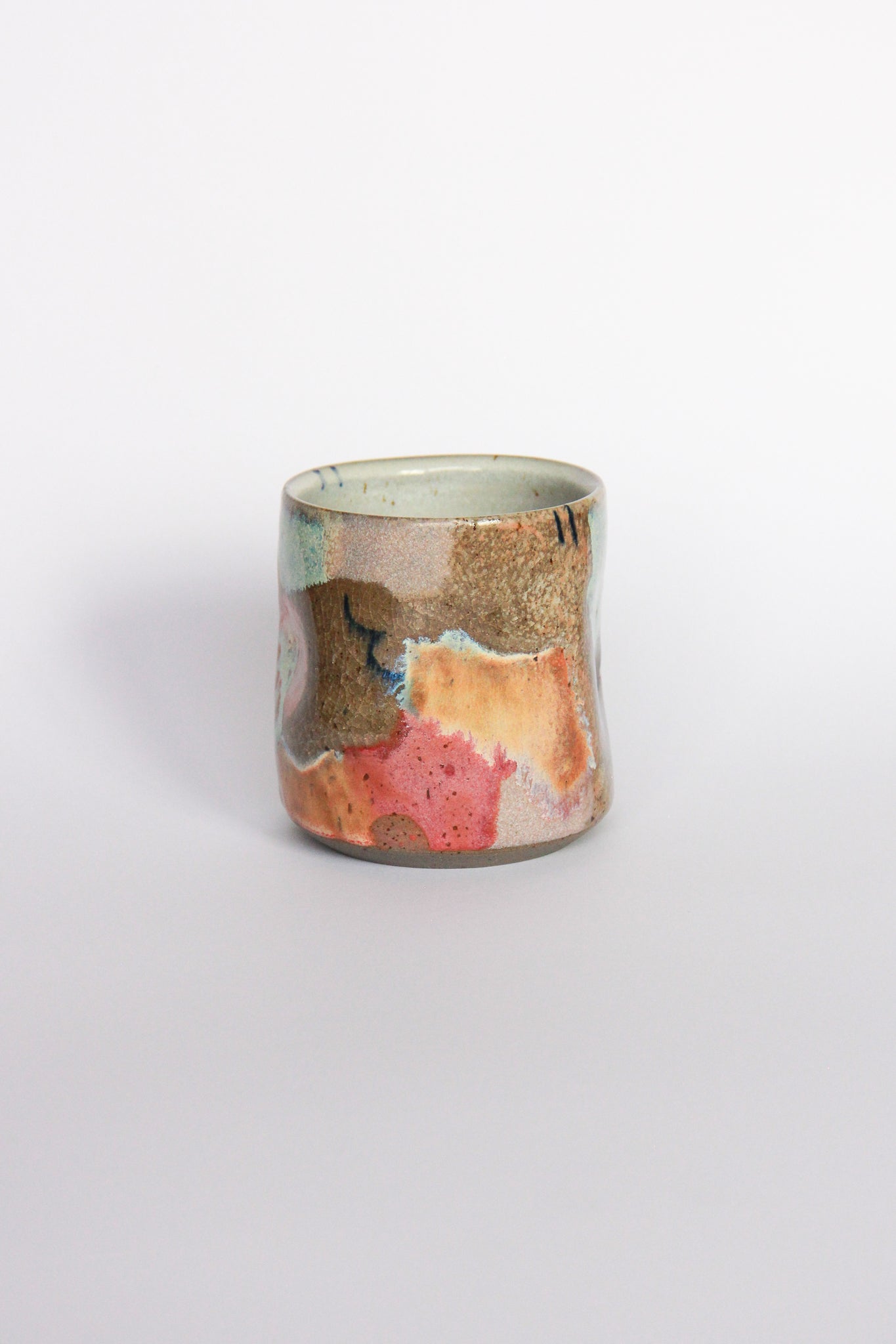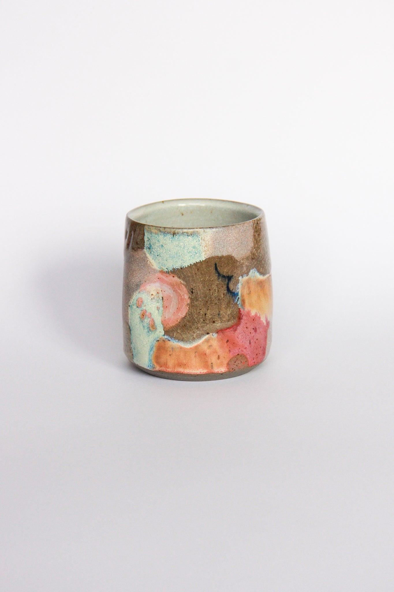 Each cup is wheel-thrown and gently altered by hand, creating subtle shifts in form that sit comfortably in the palm. Layered glazes move across the surface, allowing colour to pool, break and settle differently on every piece.