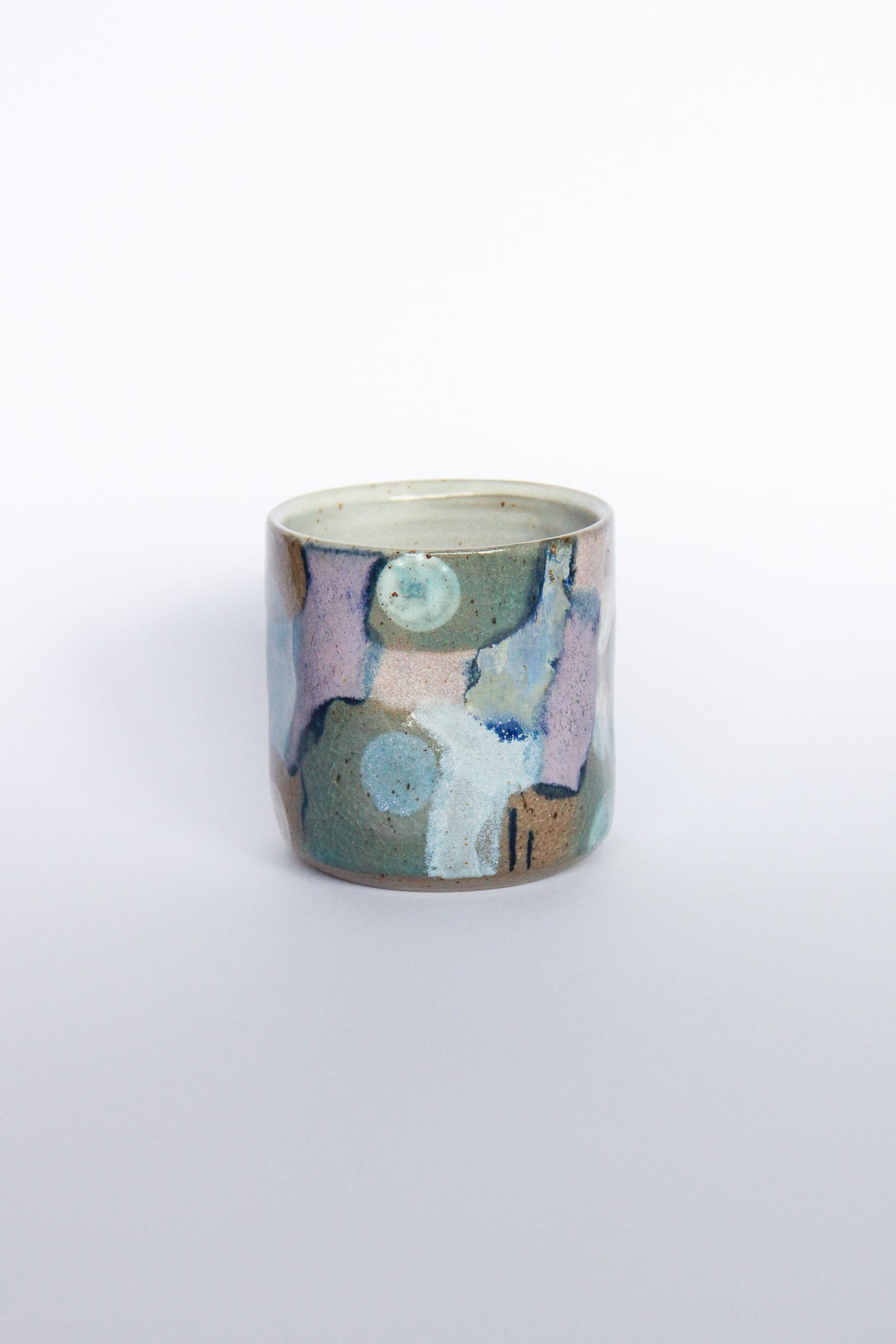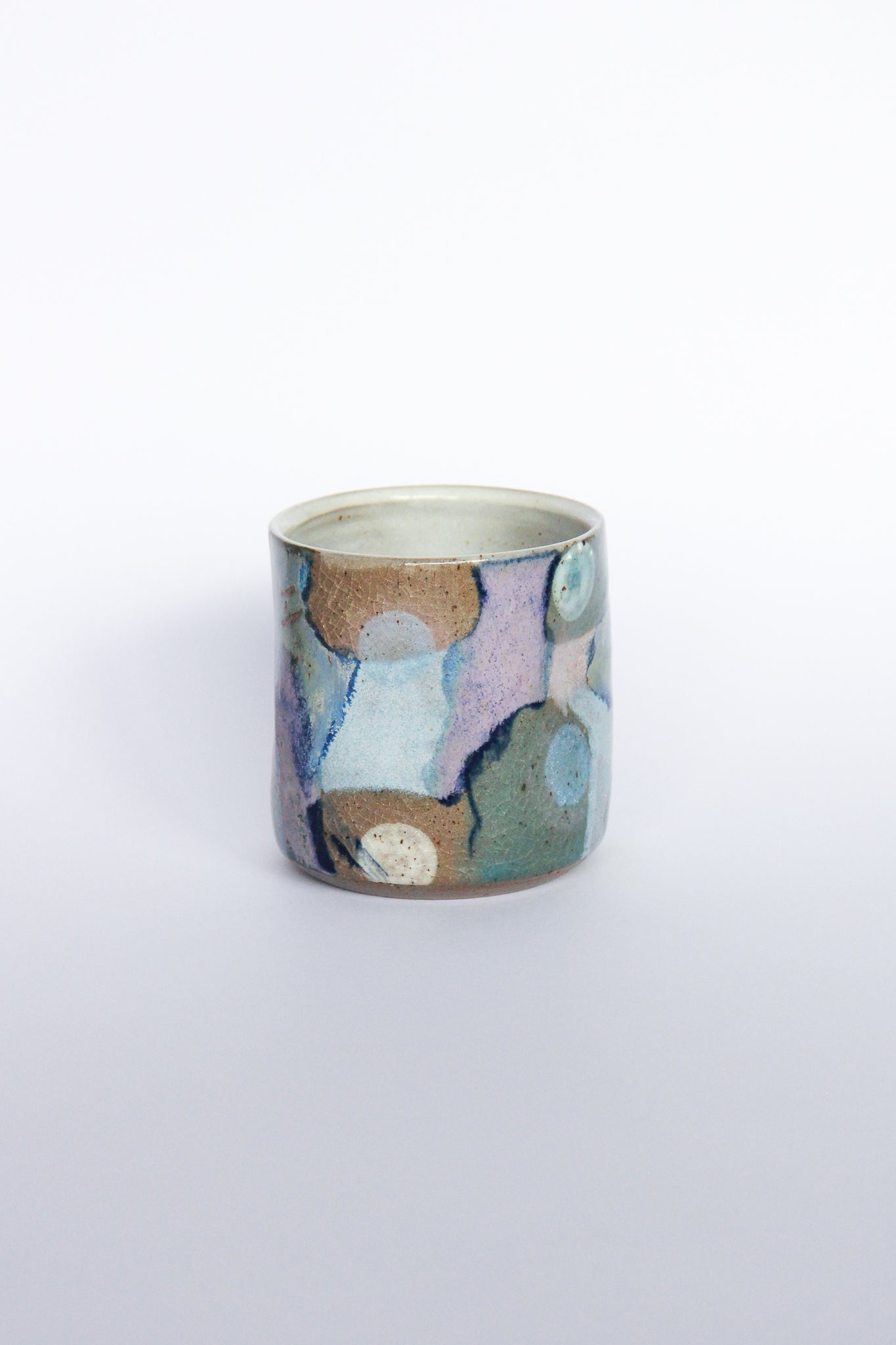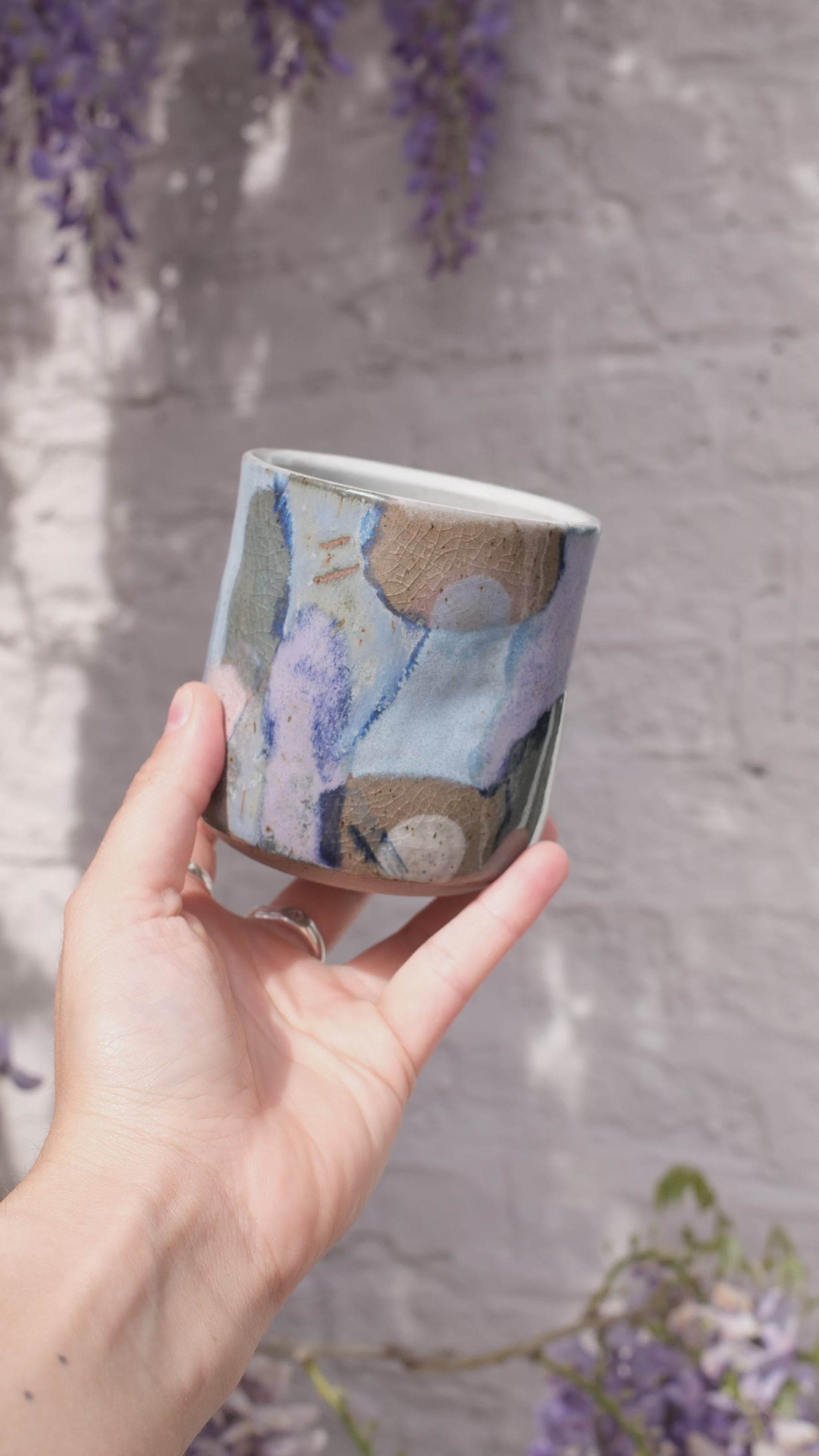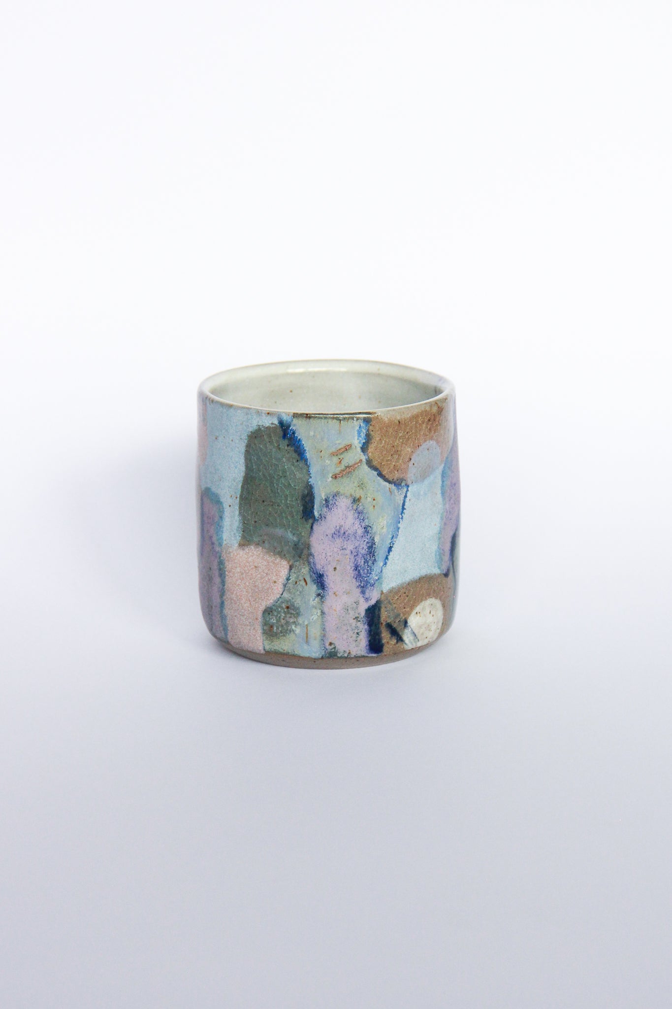 Each cup is wheel-thrown and gently altered by hand, creating subtle shifts in form that sit comfortably in the palm. Layered glazes move across the surface, allowing colour to pool, break and settle differently on every piece.