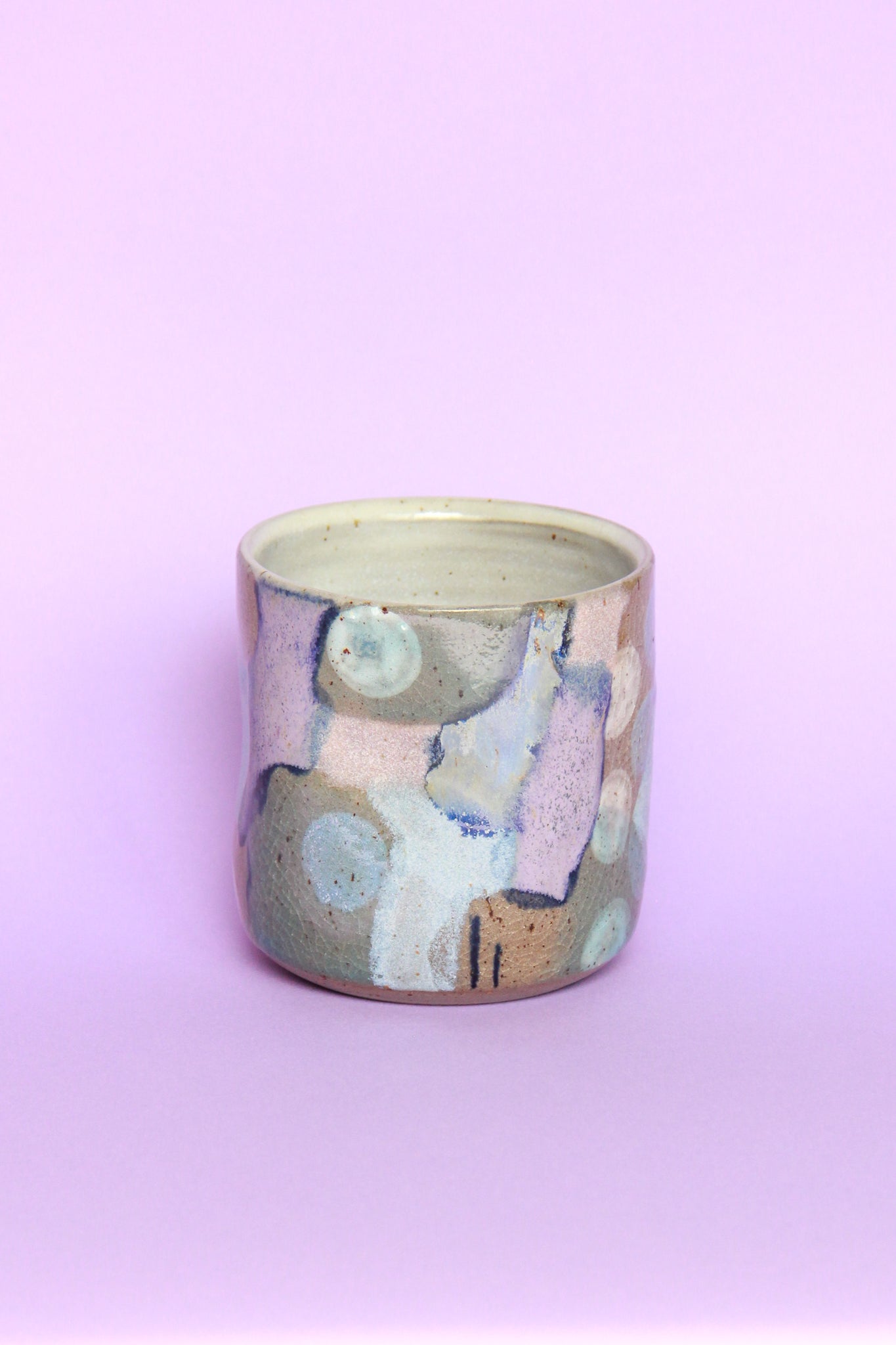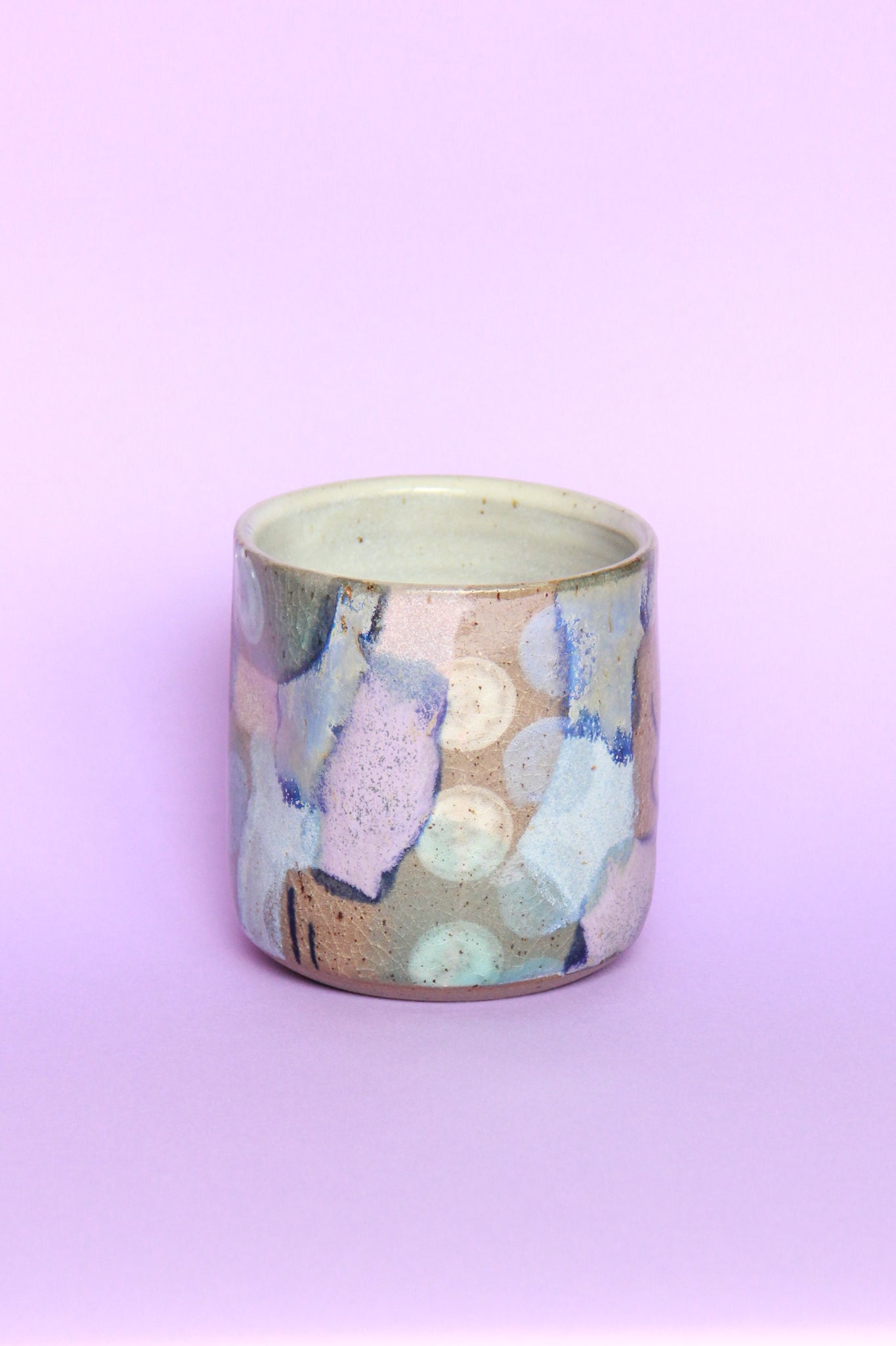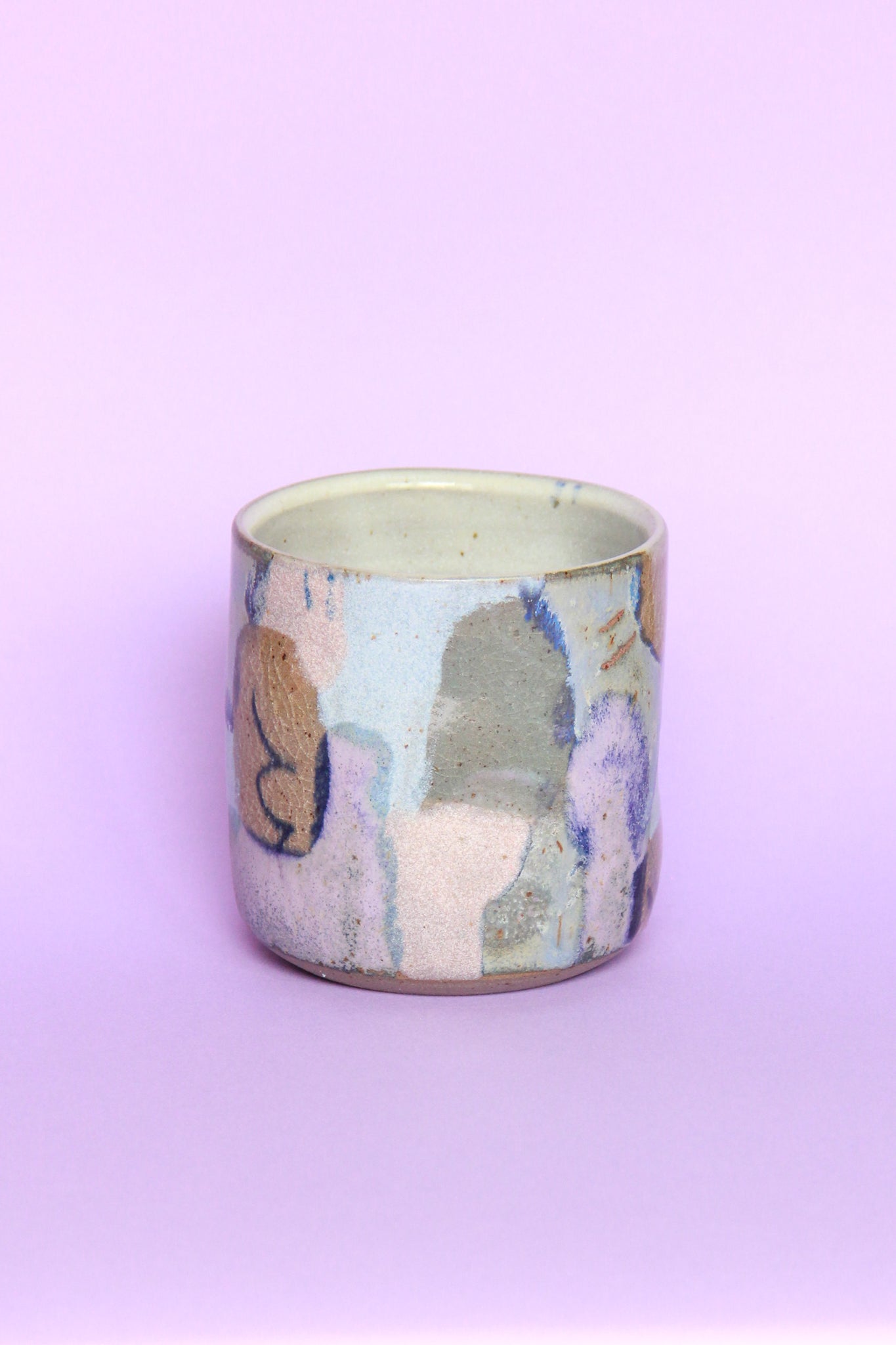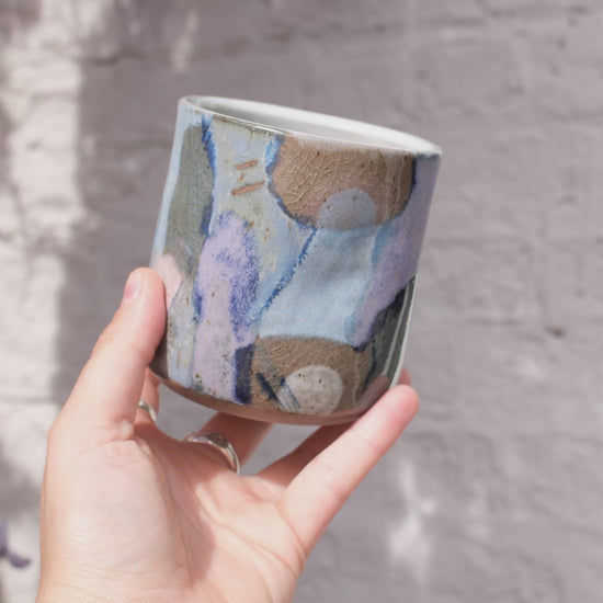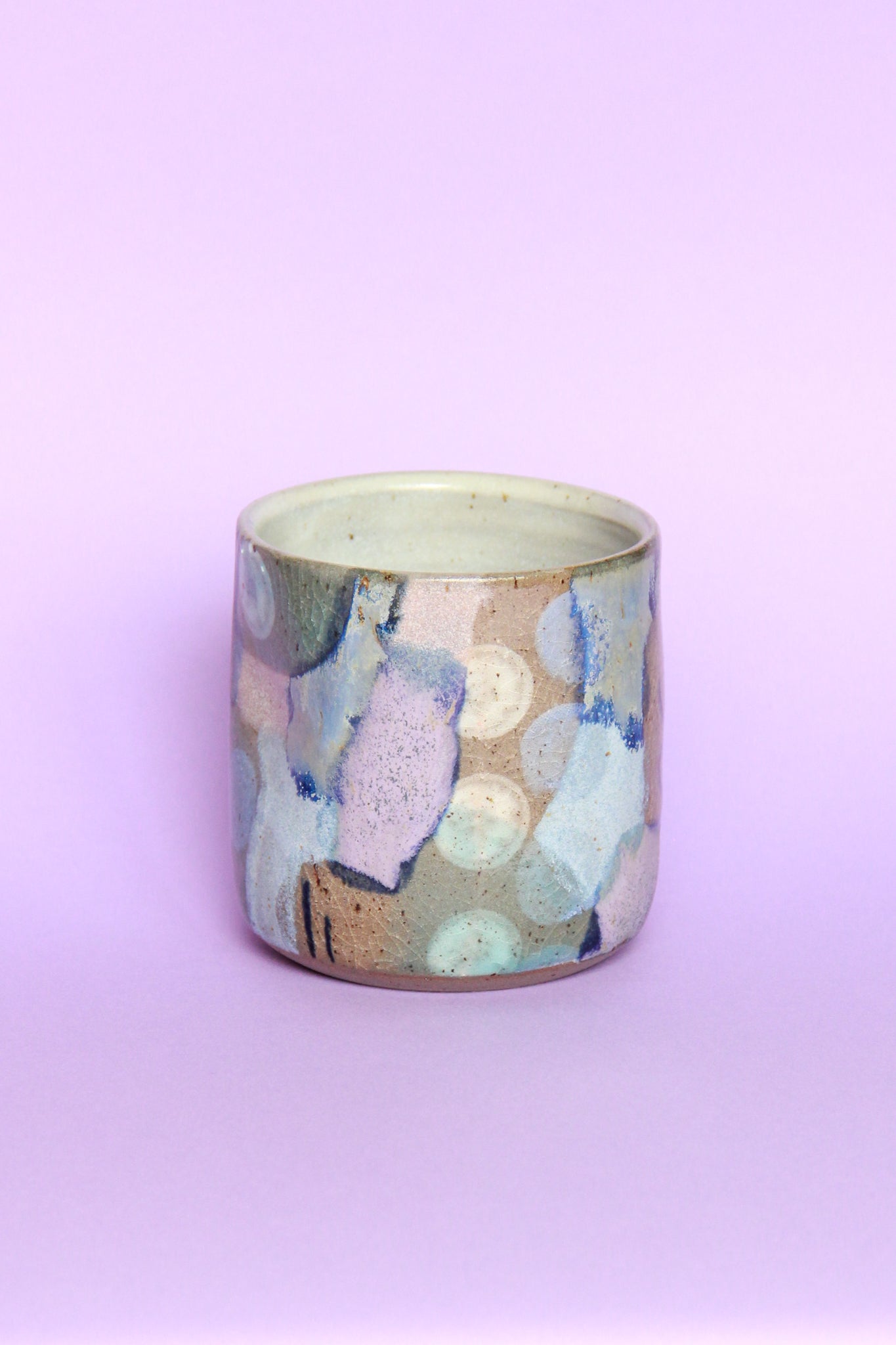 Each cup is wheel-thrown and gently altered by hand, creating subtle shifts in form that sit comfortably in the palm. Layered glazes move across the surface, allowing colour to pool, break and settle differently on every piece.